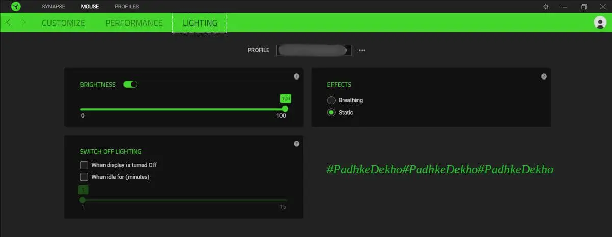 As far as light tuning goes, you can change the intensity or velocity of the Greenlight, making it have a Breathing effect or static. There are options to turn the light off when the display is turned off or when the PC is left idle for a while. Moreover, you can turn the lights off as well!